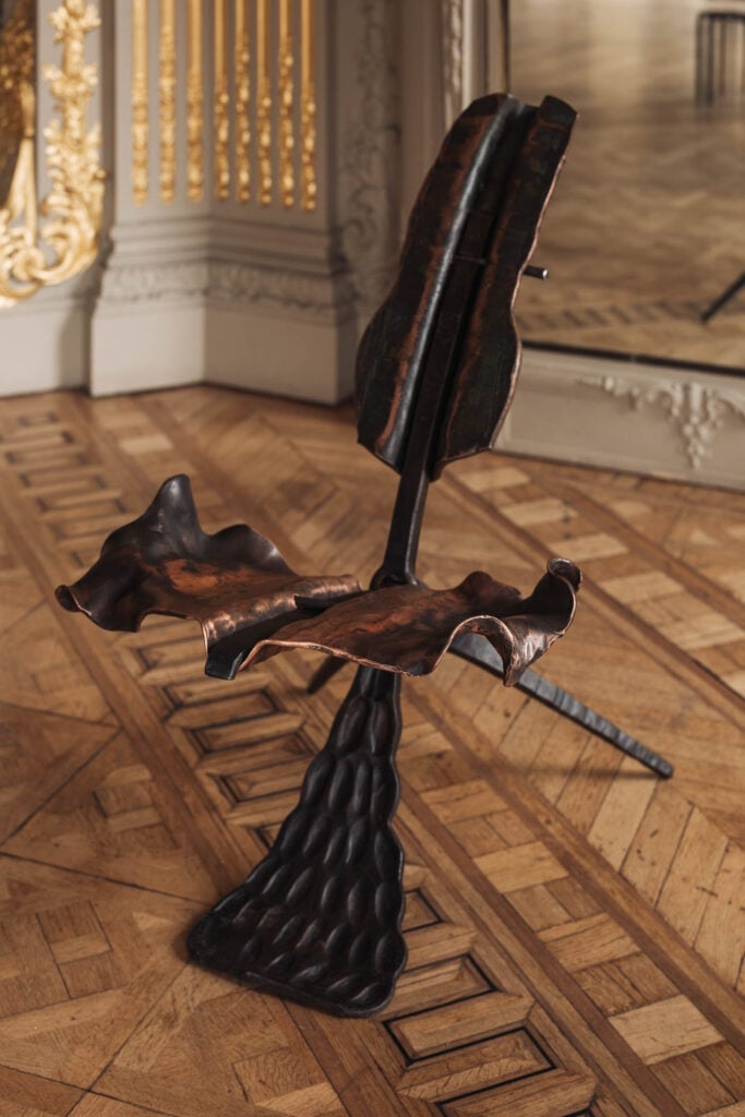 From beginning his studies at Cape Technikon in Cape Town to working in furniture restoration, what we see in his most recent work is the culmination of 30 years of experience as a blacksmith. In his most recent solo exhibition, “Implement IV,” at Objects With Narratives—a gallery located in the heart of Brussels—Hicks navigates the intersections of masculinity, associated with iron, and femininity, associated with copper, resulting in a blend of roles, expectations, and tensions that are both material and symbolic. The works inhabit a space between strength and delicacy, utility and sculpture, where each form seems to negotiate its own identity.